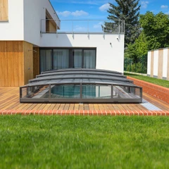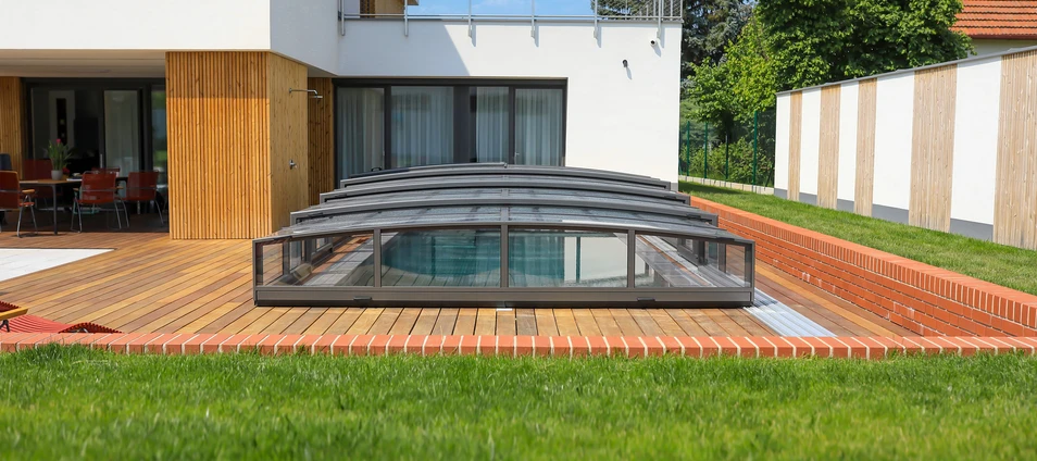 Zastřešení bazénu VIVA™ od společnosti Alukov je nízkoprofilové řešení s jednokolejnicovým systémem, který umožňuje bezbariérový přístup ze tří stran. Tento moderní design chrání bazén před nečistotami, urychluje ohřev vody a udržuje její teplotu přes noc.
