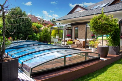 Bazénové zastřešení AZURE ANGLE v zahradě