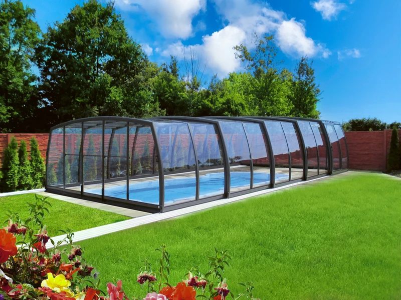 Zastřešení bazénu OMEGA™ od společnosti Alukov se vyznačuje jedinečným tvarem připomínajícím řecké písmeno omega. Díky vyklenutým stěnám nabízí plně podchozí prostor po celém obvodu bazénu, aniž by vizuálně narušovalo estetiku zahrady.